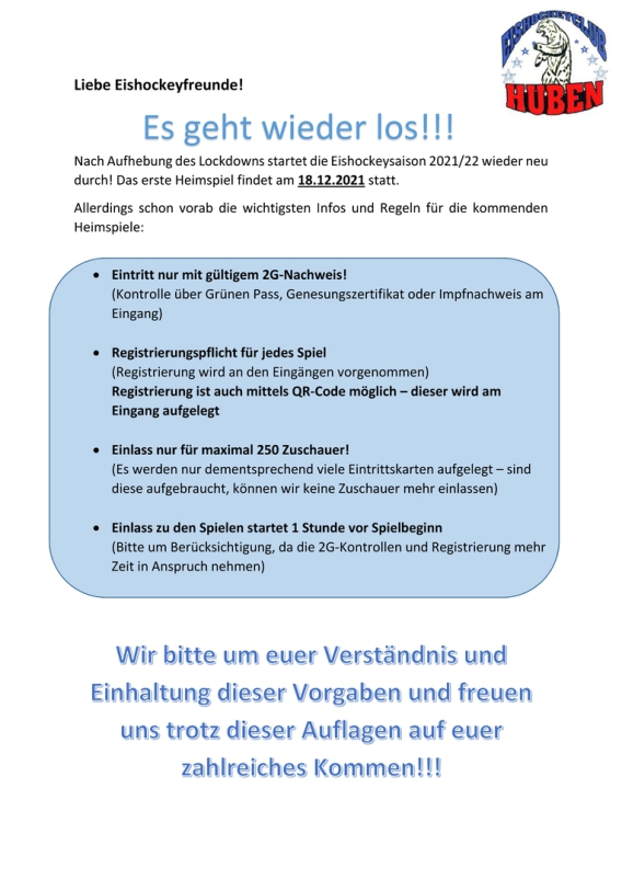 Wir bitten euch um Verständis und Einhaltung dieser Maßnahmen und freuen uns natürlich weiterhin auf euren Besuch im Eisstadion Huben!
